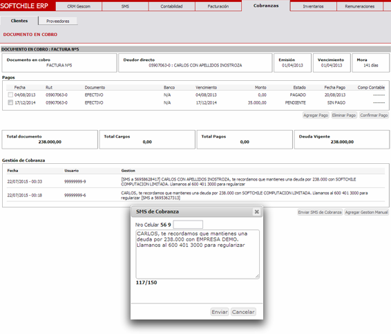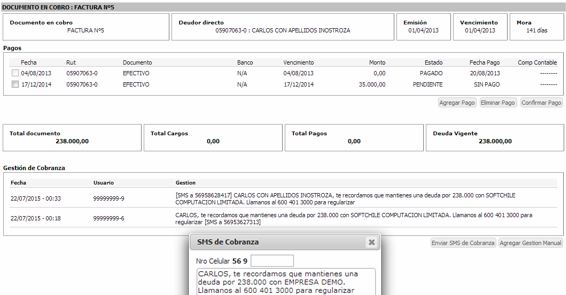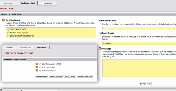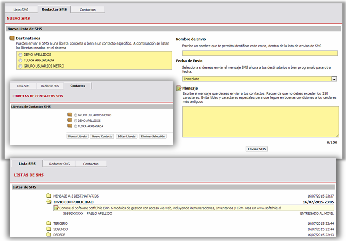 Envía mensajes de texto (SMS) a celulares de distintas compañías. Crea avisos o campañas para promociones, cobranzas, o recordatorios. Su interface permite generar libretas con varios números celulares y enviar un único mensaje a cada uno de ellos. Desde el módulo Cobranzas, podrás enviar SMS a tus clientes morosos.