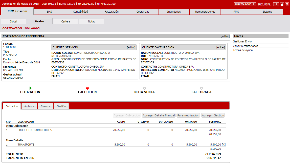 Cotiza de forma rápida y formal en 3 monedas: Peso, Dólar y UF. Envía cotizaciones en PDF a tus clientes y sigue su trazabilidad. Crea cotizaciones normales o de proyectos, crea cubicaciones, parametriza valores de cierre y formato. Controla a tus ejecutivos, revisa cuánto cotizan y cuánto venden. Otorga privilegios para enviar o recotizar.