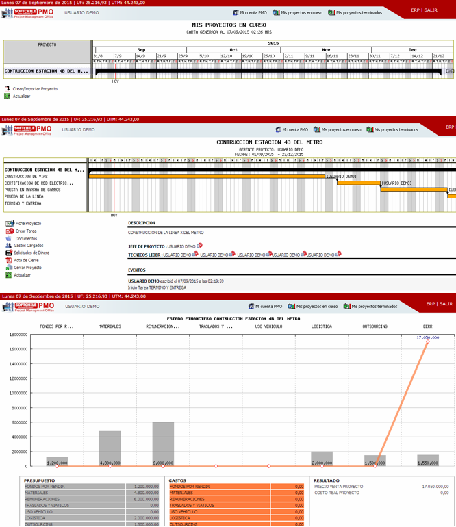 Módulo exclusivo de SoftChile ERP que controla la Ejecución de Proyectos, los cuales agrupa en una Carta Gantt automática, compuesta por hitos, tareas y eventos. PMO muestra estados financieros por proyecto, comparando lo cotizado versus los gastos reales. Esto, gracias al control de Materiales, Horas Extra y registro de gastos y rendiciones.