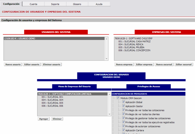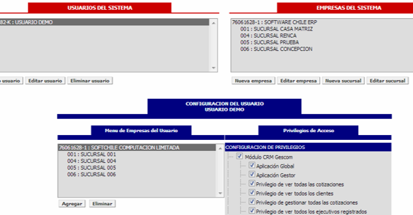 Este módulo permite controlar los accesos y privilegios de cada usuario del ERP. De esta forma, el módulo permite crear usuarios y otorgar accesos arbitrarios a los módulos y cada una de las aplicaciones que componen cada módulo. Además permite gestionar los datos de la empresa y su comportamiento.