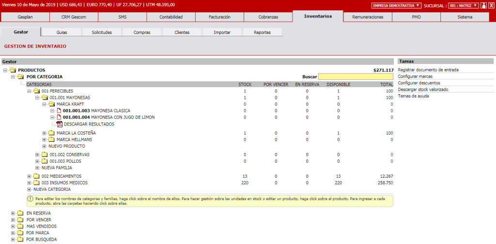 Gestiona miles de productos por código interno, de barra, marcas y proveedor. Asigna impuestos o descuentos específicos. Emite guias de despacho electrónicas, rebajando automáticamente tu stock, o carga las solicitudes de materiales en tus guias de despacho electrónicas. Genera Ordenes de Compra y confirma la recepción de mercadería con un click.